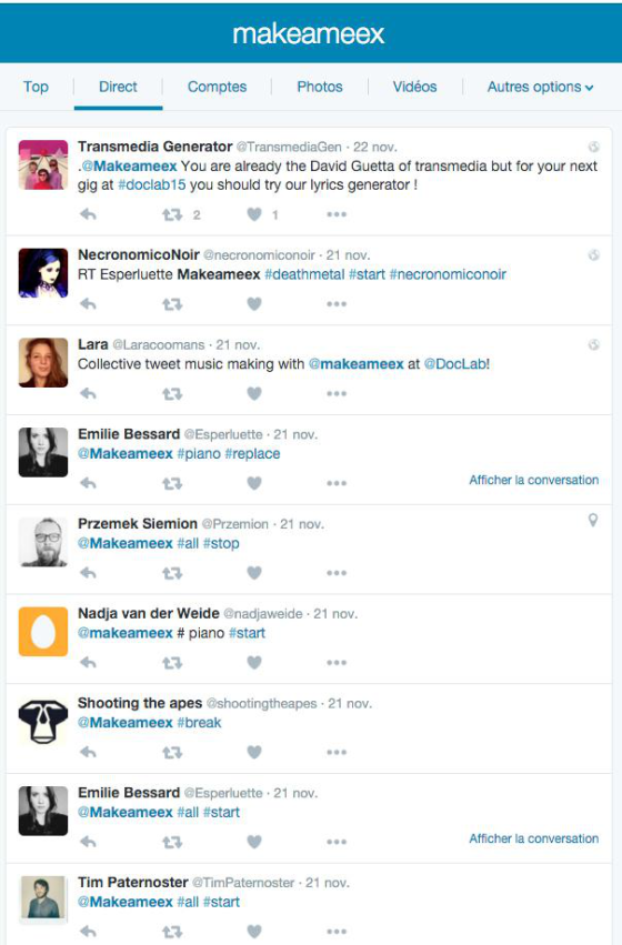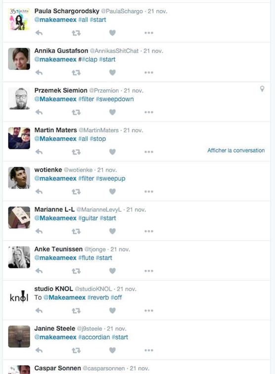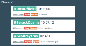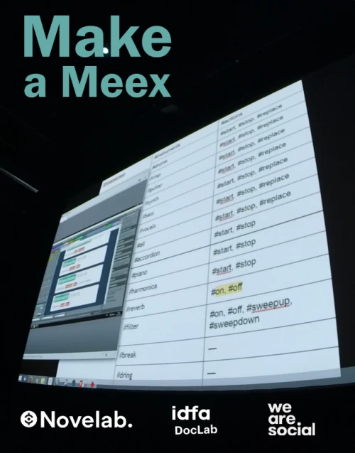 Make a Meex est une installation éphémère interactive à destination des événements publics regroupant 20 à 200 personnes. Meex permet de créer de la musique collaborative en postant des messages sur Twitter/X. Un artiste compose des boucles musicales que les utilisateurs activent via des hashtags depuis leur smartphone. Elles se mêlent, s’additionnent, se soustraient