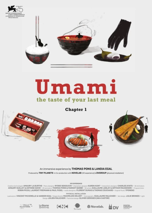 Umami est une expérience de théâtre immersif dans laquelle l’utilisateur entre dans la peau d’un personnage condamné à mort et s’apprêtant à vivre l’expérience multi-sensorielle de son dernier repas. Cette expérience très interactive mêle de façon subtile la 2D et la 3D, le réel et le virtuel et, à travers le phénomène de la “madeleine de Proust”, le temps présent et le passé du personnage, la vie, la mort et les souvenirs.